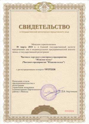 Свидетельство № 191372336 выдано Минским горисполкомом 30.03.2010 г.